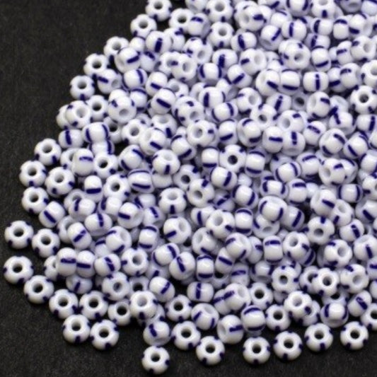 2/0 03330 Preciosa Чехски стъклени Малки Мъниста Рокайли 6.1mm. Сини ивици на бял тебешир.