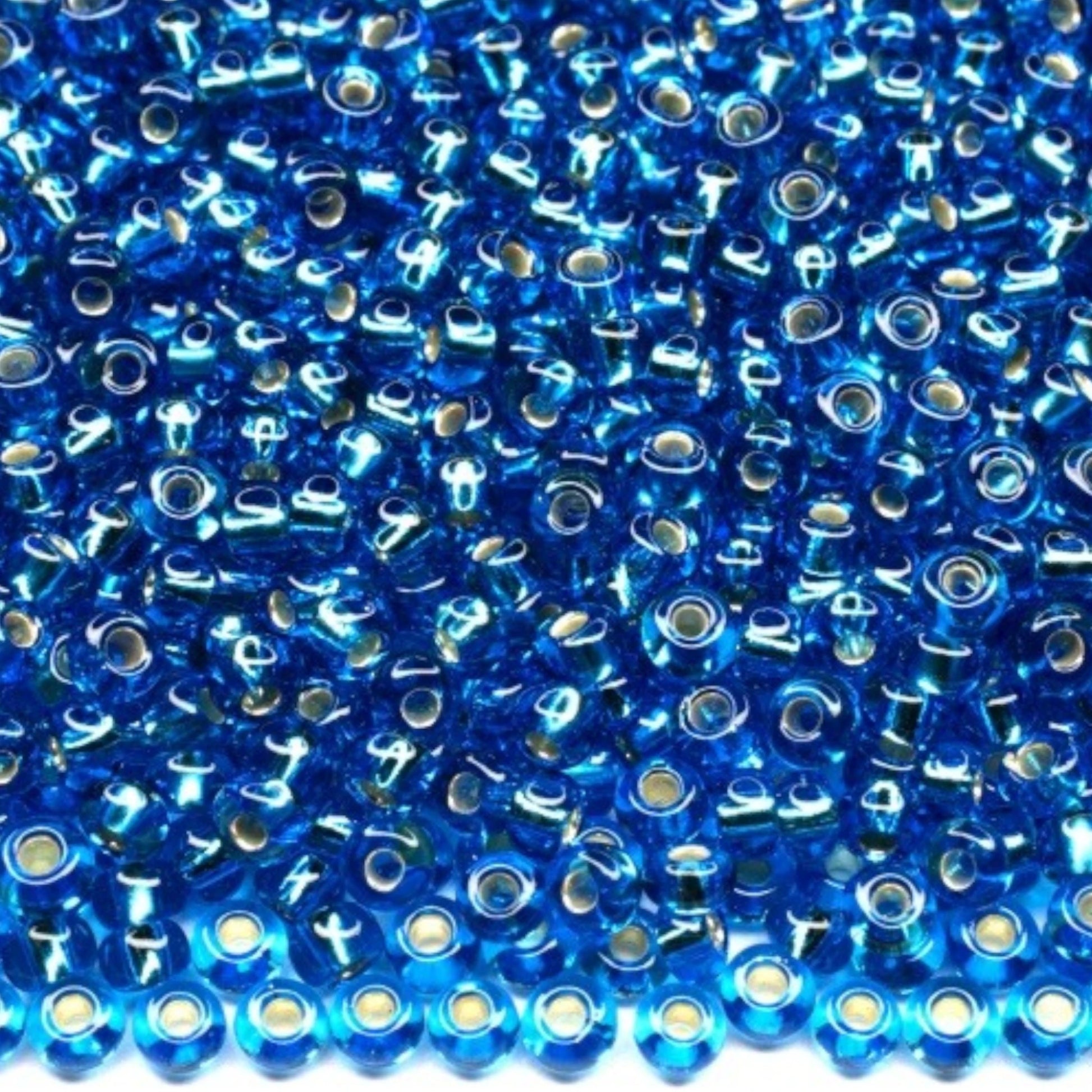 10/0 67150 Preciosa tschechische Glasperlen Rocailles 2,3 mm. Blau transparent silberumhüllt.