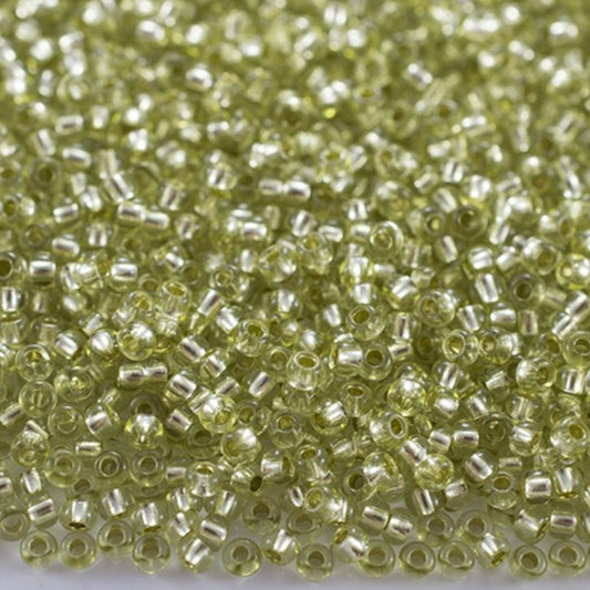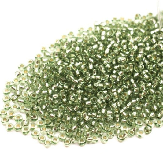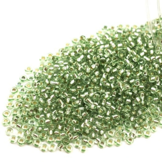 10/0 78152 Preciosa Cseh Üveg Magtartalmú Gyöngyök (Kásagyöngy) Rocailles 2.3mm. Zöld 2 festett Kristály, Ezüst Béléssel.