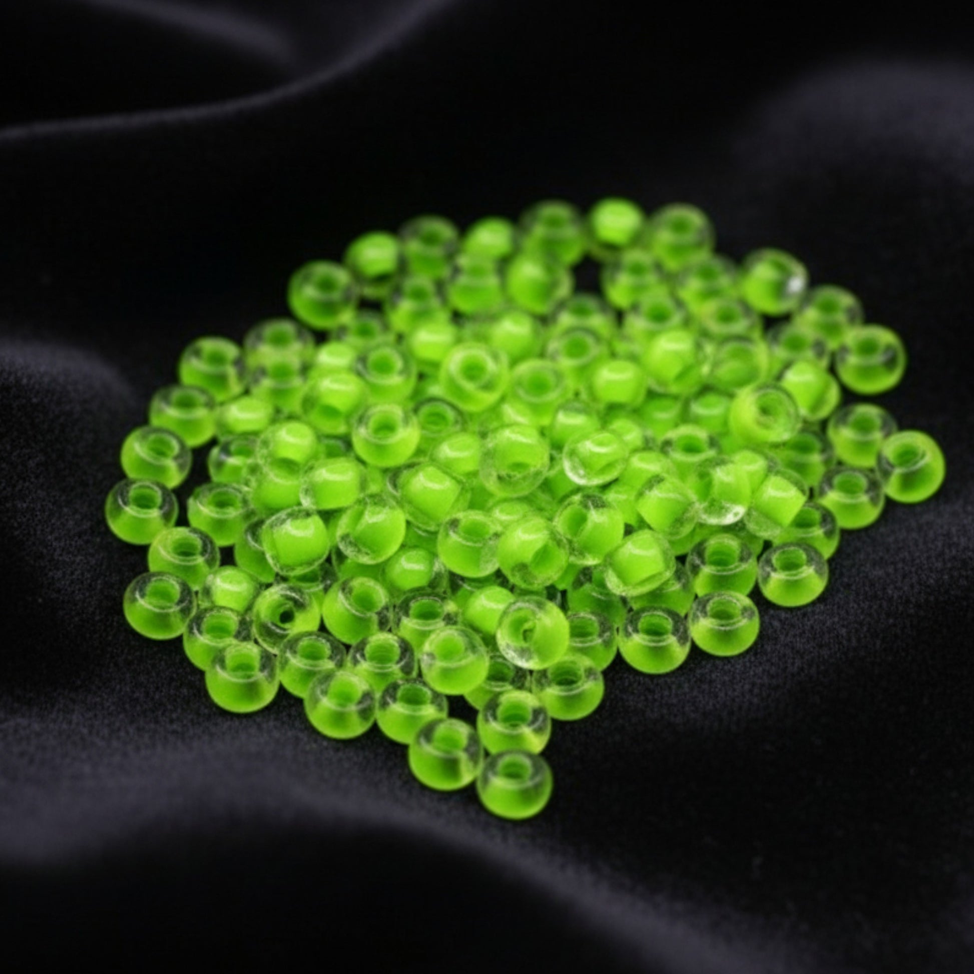 10/0 08A54 Preciosa Cseh Üveg Magtartalmú Gyöngyök (Kásagyöngy) Rocailles 2.3mm. Terra Intensiv Lined - Zöld.