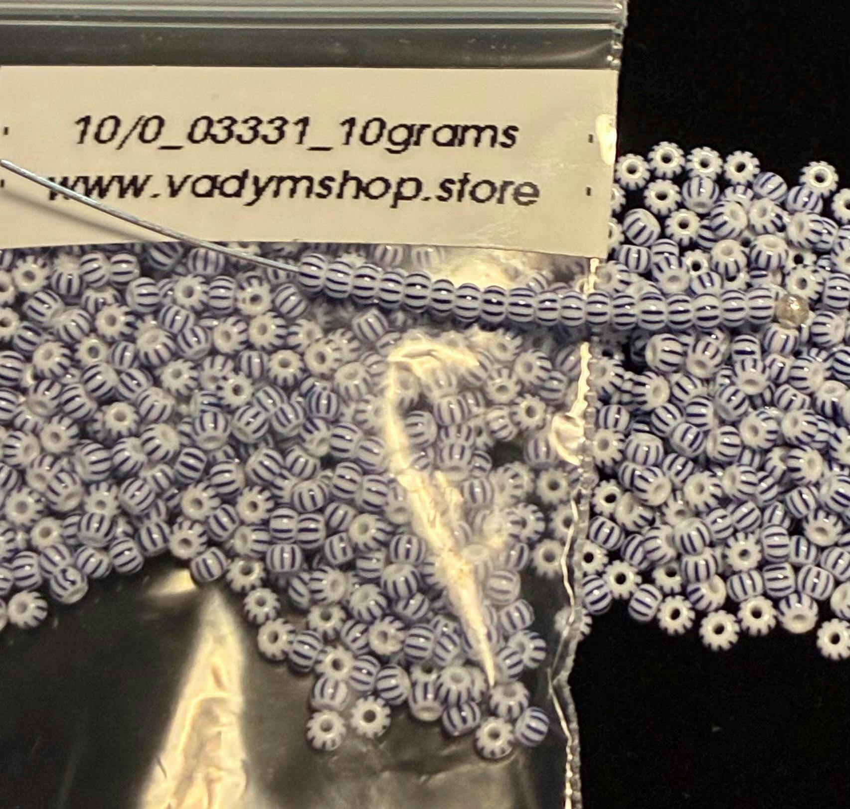 Excellent, as described. Opaque white striped with 10 narrow blue lines—I counted :) Fits on 24-gauge head pin (0.51 mm), see my photo. Arrived in 10 days; packed carefully in labeled baggies :) Durable stripes, not painted on.