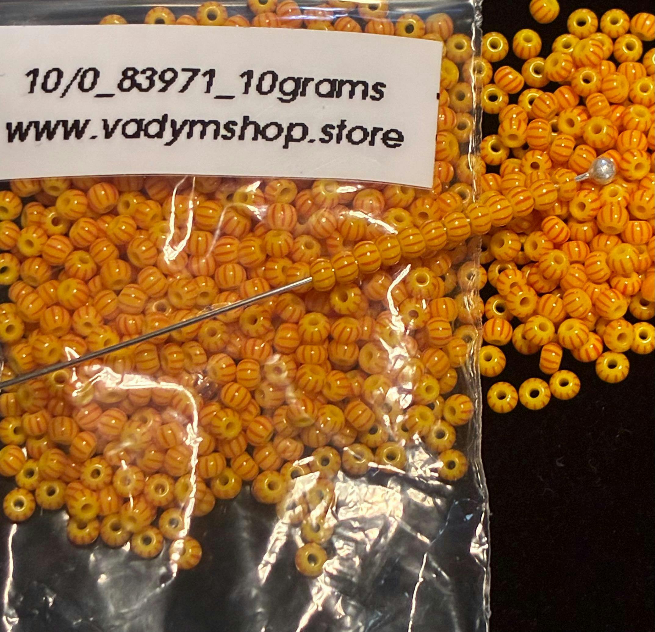 Excellent, as described :) Opaque harlequins, half yellow, half royal blue — fun :) Fits on 21-gauge head pin (0.723 mm), see my photo. Arrived in 10 days. Shipped carefully; bagged & labeled with size and Preciosa color code. Preciosa Ornela seed beads have a sweet, puffy doughnut shape, not flat like Toho, Miyuki, or Matsuno. Vadym filled my order accurately — Preciosa 11/0 holes are a struggle for 0.5mm cord, but 10/0 are just right (size similar to 11/0 Japanese beads).