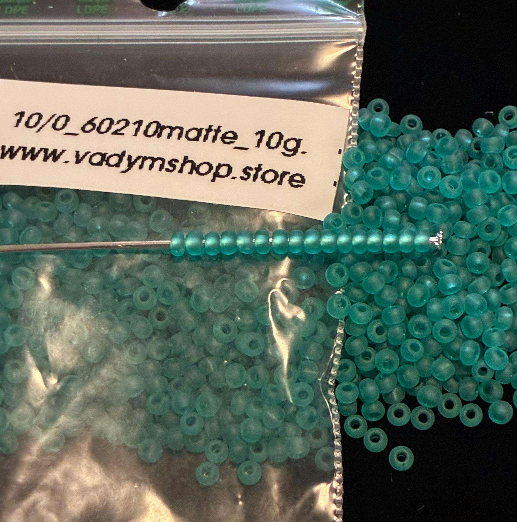 Excellent, as described :) Matte green aqua. Fits on 21-gauge head pin (0.723 mm), see my photo. Arrived in 10 days. Shipped carefully; bagged & labeled with size and Preciosa color code. Preciosa Ornela seed beads have a sweet, puffy doughnut shape, not flat like Toho, Miyuki, or Matsuno. Vadym filled my order accurately — Preciosa 11/0 holes are a struggle for 0.5mm cord, but 10/0 are just right (size similar to 11/0 Japanese beads).